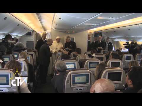 Grazie, grazie per la domanda. Quella Preghiera per la pace, assolutamente non è stata un fallimento. Primo, l’iniziativa non è venuta da me: l’iniziativa di pregare insieme è venuta dai due Presidenti, dal Presidente dello Stato di Israele e dal Presidente dello Stato di Palestina. Loro mi avevano fatto arrivare questo desiderio. Poi, volevamo farla là [in Terra Santa], ma non si trovava il posto giusto, perché il costo politico di ognuno era molto forte se andava dall’altra parte. La Nunziatura, sì, sarebbe stata un posto neutrale, ma per arrivare in Nunziatura il Presidente dello Stato di Palestina sarebbe dovuto entrare in Israele e la cosa non era facile. E loro mi hanno detto: "Lo facciamo in Vaticano, e noi veniamo!". Questi due uomini sono uomini di pace, sono uomini che credono in Dio, e hanno vissuto tante cose brutte, tante cose brutte che sono convinti che l’unica strada per risolvere quella storia lì è il negoziato, il dialogo e la pace. Ma la sua domanda, adesso: è stato un fallimento? No, io credo che la porta è aperta. Tutti e quattro, come rappresentanti, e Bartolomeo ho voluto che fosse lì come capo dell’Ortodossia, Patriarca ecumenico dell’Ortodossia – non voglio usare termini che forse non piacciono a tutti gli ortodossi – come Patriarca ecumenico era bene che fosse con noi. E’ stata aperta la porta della preghiera. E si dice: "Si deve pregare". E’ un dono, la pace è un dono, un dono che si merita con il nostro lavoro, ma è un dono. E dire all’umanità che insieme con la strada del negoziato – che è importante -, del dialogo – che è importante – c’è anche quella della preghiera. Giusto. Dopo è arrivato quello che è arrivato. Ma questo è congiunturale. Quell’incontro invece non era congiunturale: è un passo fondamentale di atteggiamento umano: la preghiera. Adesso il fumo delle bombe, delle guerre non lascia vedere la porta, ma la porta è rimasta aperta da quel momento. E siccome io credo in Dio, io credo che il Signore guarda quella porta, e guarda quanti pregano e quanti gli chiedono che Lui ci aiuti. Sì, mi piace questa domanda. Grazie, grazie per averla fatta. Grazie.
