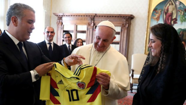 Il Capo di Stato colombiano ha ringraziato il Pontefice per averlo ricevuto, affermando che tutti i Colombiani sono stati felici per la sua visita nel Paese nel 2017. Duque gli ha consegnato la maglietta durante il tradizionale scambio di doni insieme ad altri regali.