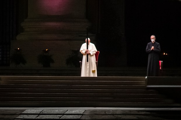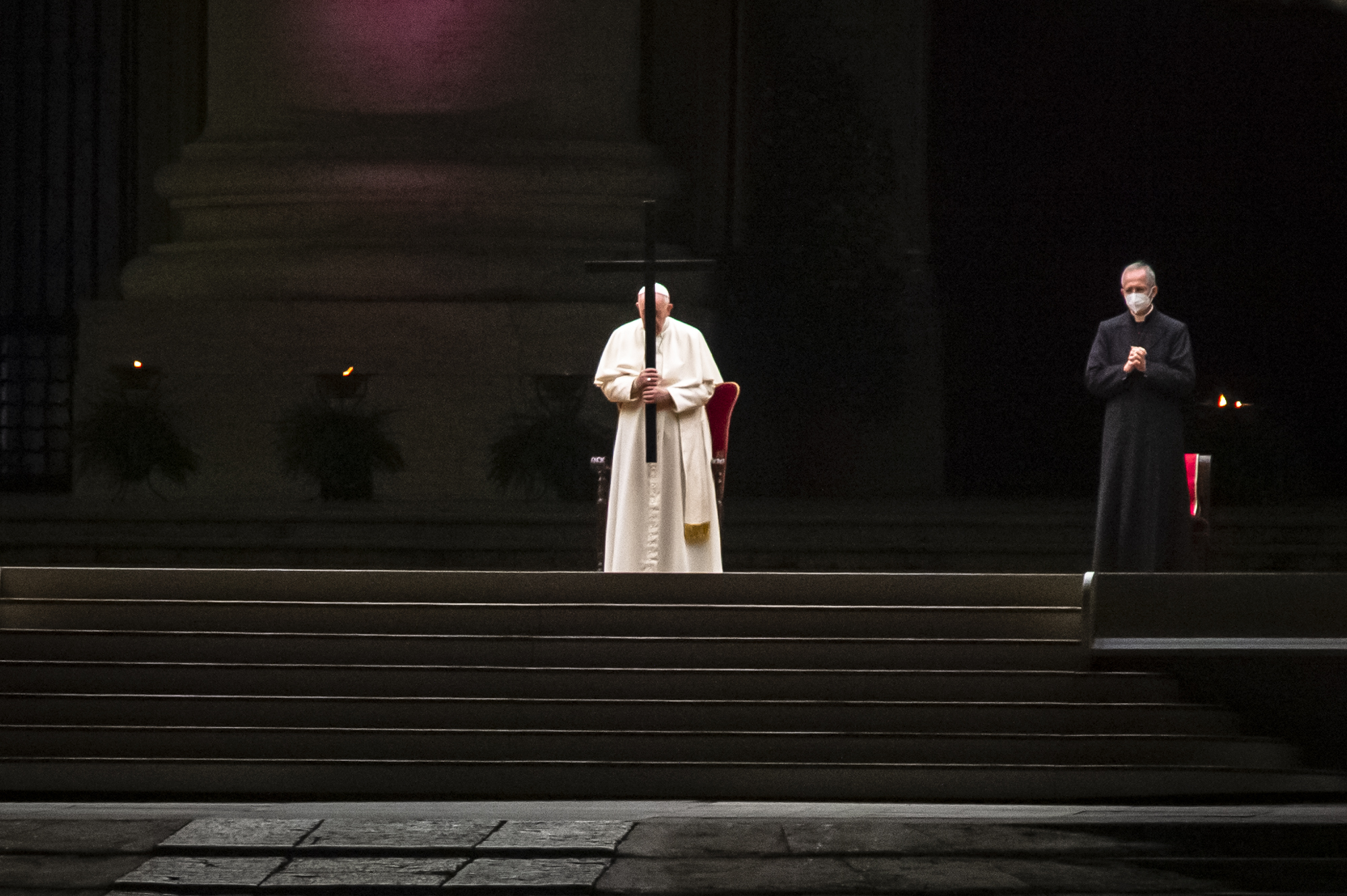 Sono le ultime immagini del rito che si è tenuto per la seconda volta, a causa della pandemia, in Piazza San Pietro, abbandonando così il tradizionale e suggestivo scenario del Colosseo. Ma negli occhi rimarrà la grande croce luminosa disegnata dalle torce e distesa sulla piazza vuota, con l’obelisco al centro, la base sul sagrato e le due braccia che arrivano fino alle fontane sui due lati. E nel gruppo dei portatori della croce, che camminano proprio all’interno della grande croce luminosa, una suora e un bambino che portano una fiaccola insieme, quasi abbracciati.