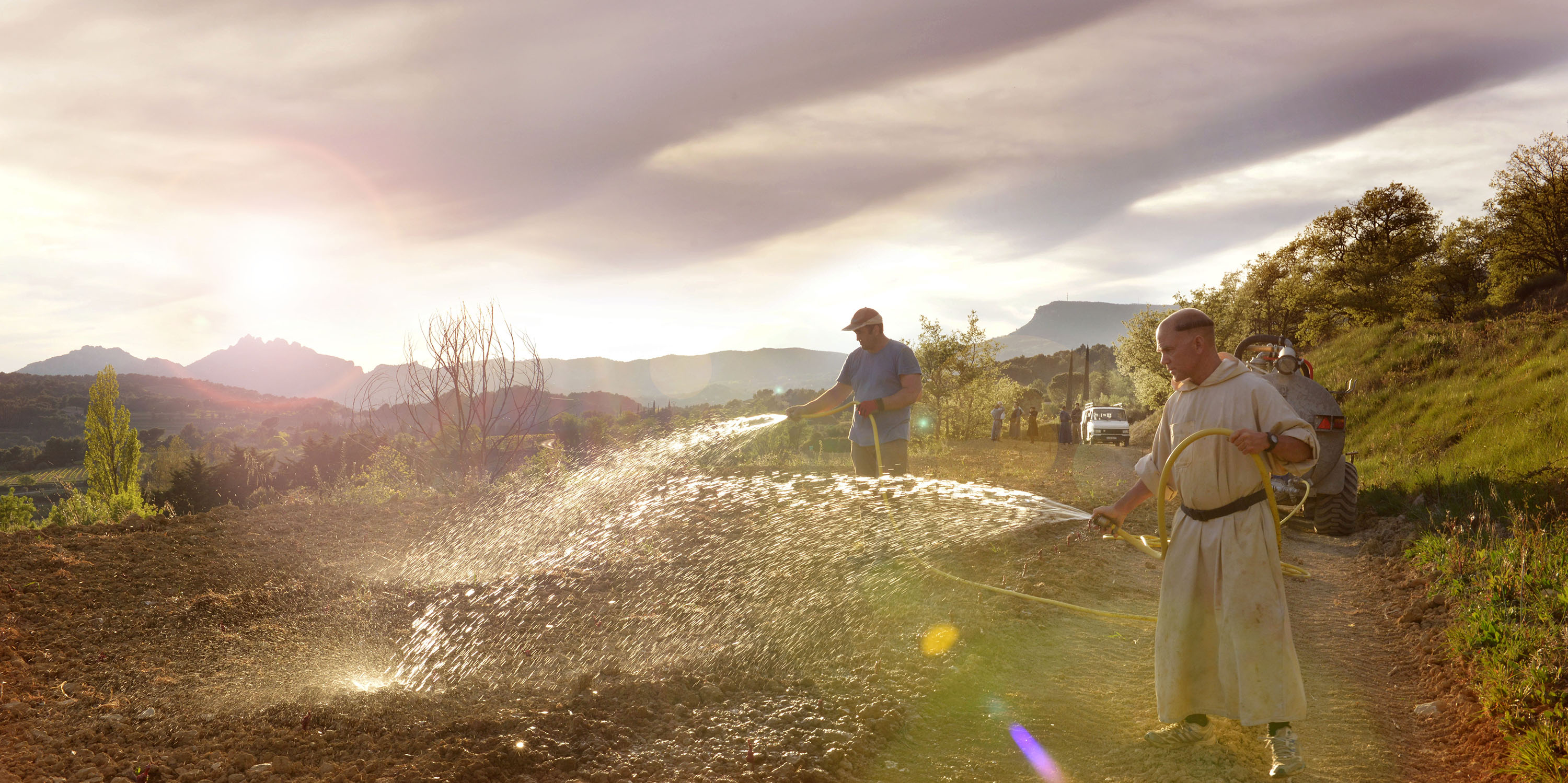 I monaci meditano e cantano le lodi di Dio prima di raccogliere sotto il sole della Provenza i frutti della vite, che il bel tempo ha portato a maturazione. “Ora et labora” è il loro motto: lavorano in silenzio con gesti precisi e un ritmo regolare. Di tanto in tanto guardano in alto per ringraziare Dio per quell'abbondanza. Il duro lavoro della vigna assicura la loro sussistenza, e permette di guadagnarsi una via verso il Cielo.