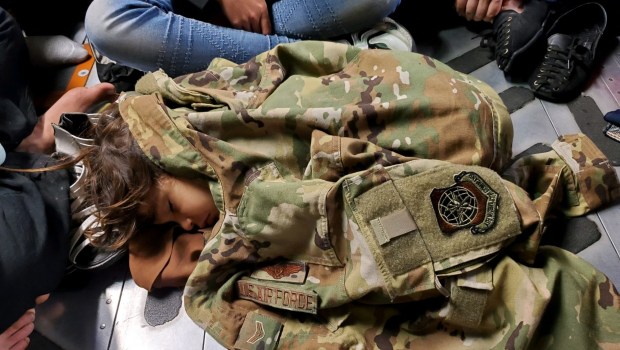 I bambini crollano esausti su un aereo che li porta lontano, verso un futuro che qui non si vede più. Come questo piccolo evacuato su un cargo americano il 15 agosto insieme ad altre seicento persone. La giacca mimetica dei militari invece del suo Dudù. Dorme come le mie figlie. Che lo guarderesti estasiato per ore. Che vorresti mordere quelle guance per sapere che sapore hanno.