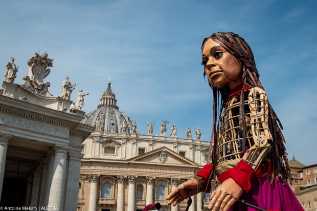 Questo venerdì una marionetta alta 3,5 metri è arrivata in piazza San Pietro, vicino al monumento Angels Unawares, la scultura dei migranti, inaugurata due anni fa. La marionetta, Amal, rappresenta una bambina rifugiata che, partita il 27 luglio da Gaziantep, al confine turco-siriano, gira l'Europa in cerca della sua mamma fino ad arrivare a Manchester, nel Regno Unito.