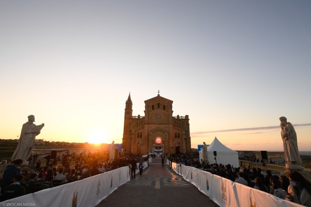 Il Papa approda sull'isola intorno alle 17.30 - dopo una lenta circumnavigazione della costa a bordo di un catamarano dalla cui cima ha potuto ammirare lo splendido panorama - accompagnato dal cardinale Mario Grech, segretario generale del Sinodo dei vescovi, e dall'arcivescovo di Malta, monsignor Charles Scicluna. In papamobile, lungo strade imbandierate e affollate, Francesco si dirige all’entrata laterale della Basilica per recarsi nella cappella, qui recita tre Ave Maria, rispettando la tradizione legata al Santuario, e saluta alcuni fedeli. Poi, nel grande piazzale dove l'attendono circa 3.000 persone, l'Incontro si apre con le parole di saluto del vescovo di Gozo, monsignor Anthony Teuma.